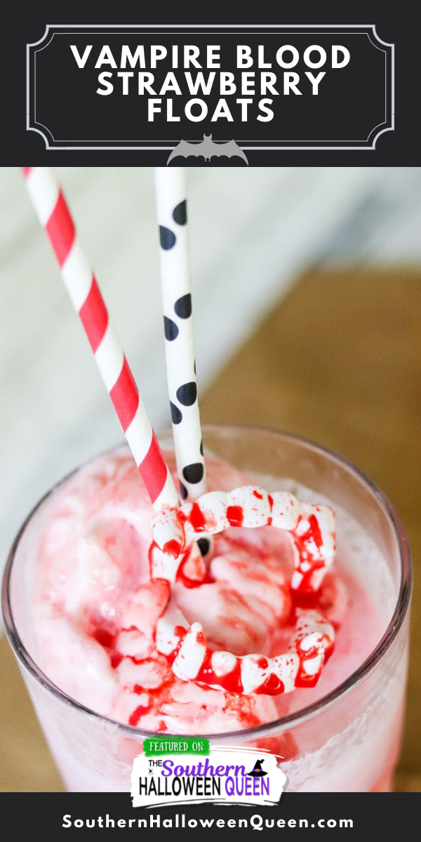 These are literally a basic, but very delicious Strawberry Float, with homemade edible vampire blood.